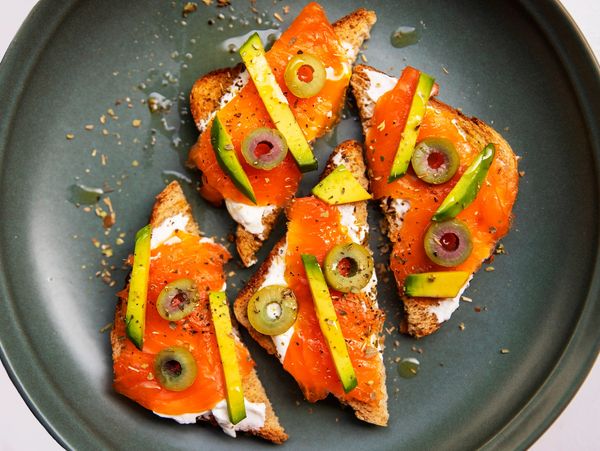Salmon over Whole wheat or white Toast, Paired with sliced olives, Feta cheese. Bowl Parade, we specialize in crafting savory food bowls that are easy to eat and full of flavor.