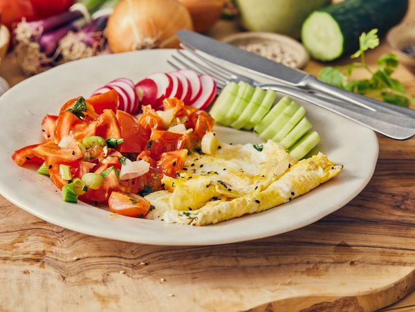 A Favorite Low Carb Option: Savory Scrambled Egg Bowl. Free Range Eggs with cucumbers, tomatoes, radish, green onions and avocado. For the low carb option tomatoes may be removed. Each bowl may include an additional protein like chicken, beef or salmon or an additional serving of free range eggs