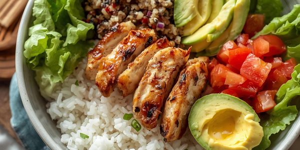 The Bowl Parade Grilled chicken is served over crisp lettuce, paired with avocado, onions, fresh tomatoes and quinoa. You have the option of adding beans or corn. Cilantro sauce or olive oil with lemon pair well. White or Brown Rice may be included, hello taste buds.