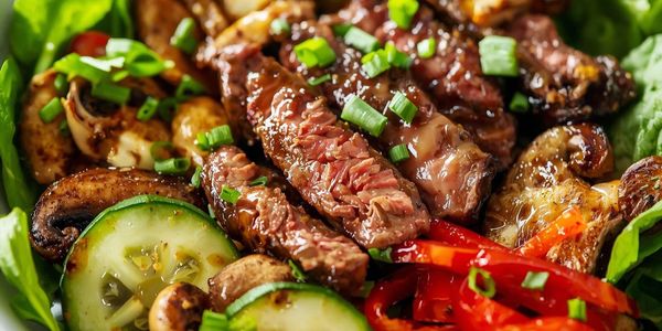 A Bowl Parade Special: Fresh Spinach, Cucumbers, Grilled Mushrooms, Quinoa, Savory Red Peppers and green onions in a savory food bowl. Each bowl is made with high-quality, tender grilled beef, chicken or salmon. BCS (Beef or Chicken or Salmon)